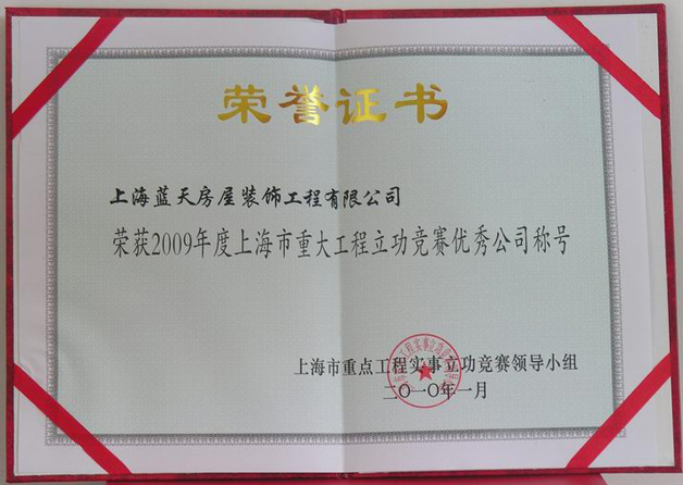 2010年1月,藍(lán)天公司第五次被上海市重點(diǎn)工程實事立功競賽領(lǐng)導(dǎo)小組評為優(yōu)秀公司,這是藍(lán)天公司自2005年以來,第五次被評為優(yōu)秀公司。