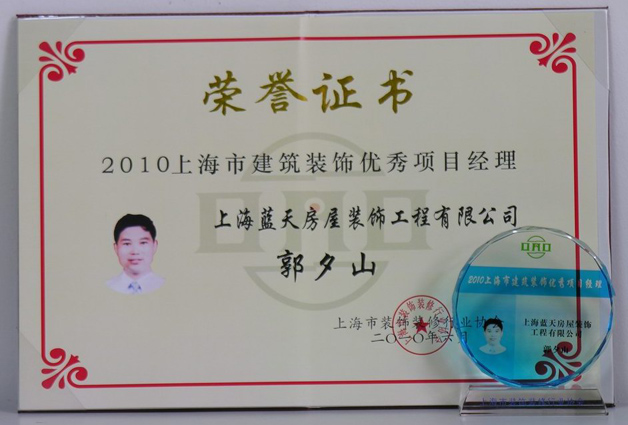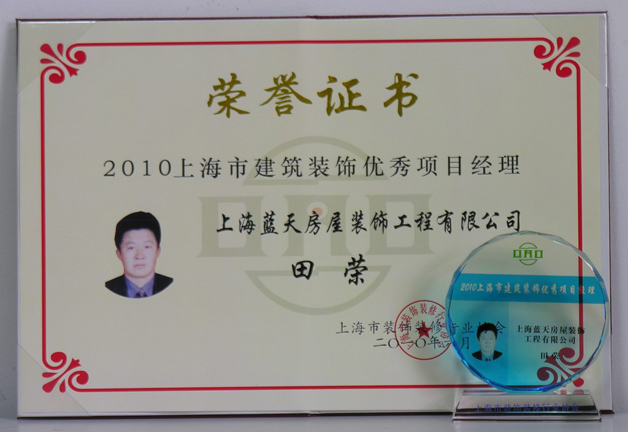 2010年06月,藍(lán)天公司田榮、郭夕山、蘇宏明三位項(xiàng)目經(jīng)理被評(píng)為上海市建筑裝飾優(yōu)秀項(xiàng)目經(jīng)理。