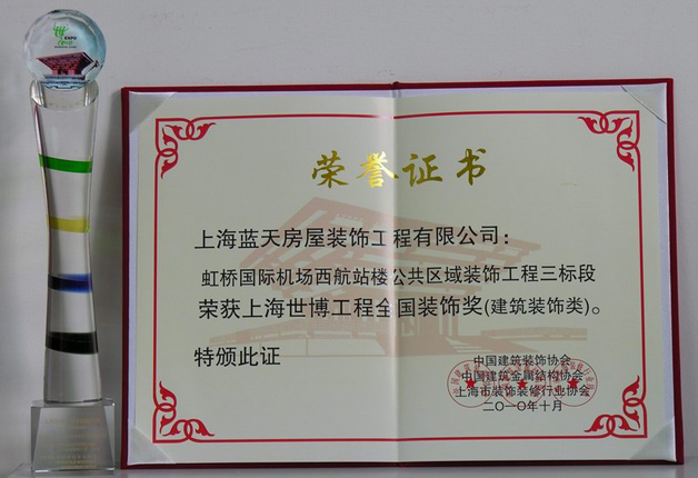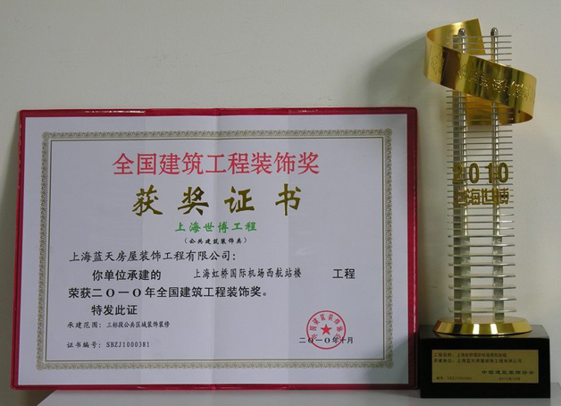 2010年10月,由藍天公司承建的上海虹橋國際機場西航站樓裝飾裝修工程榮獲上海世博·公共建筑裝飾類全國建筑工程裝飾獎和上海世博工程全國優(yōu)秀設計獎。