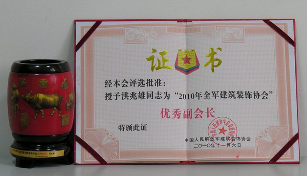 2010年11月,藍(lán)天公司洪兆雄總經(jīng)理被評為2010年全軍建筑裝飾行業(yè)優(yōu)秀企業(yè)經(jīng)理,并被評為協(xié)會優(yōu)秀副會長。