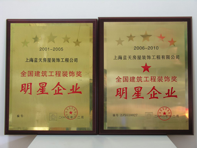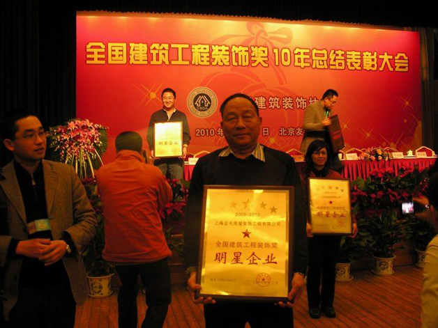 201012月,藍(lán)天公司被評為星級明星企業(yè),全國僅有29家連續(xù)10年獲得全國建筑工程裝飾獎的企業(yè)榮獲此殊榮。