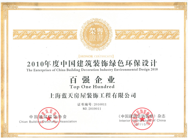 藍(lán)天公司設(shè)計(jì)、施工兩手抓,全面發(fā)展,在保障施工高品質(zhì)的同時(shí)創(chuàng)造設(shè)計(jì)品牌,2011年5月公司第二次被中國(guó)建筑裝飾協(xié)會(huì)評(píng)為“中國(guó)建筑裝飾綠色環(huán)保設(shè)計(jì)百?gòu)?qiáng)企業(yè)”。