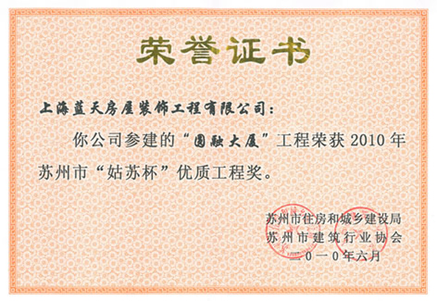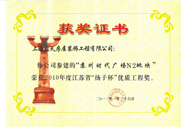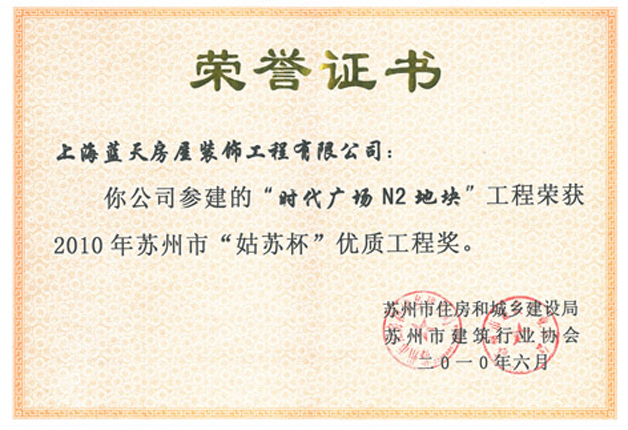 藍天公司蘇州圓融國稅、時代廣場N2地塊這兩個裝飾工程榮獲2010年蘇州市“姑蘇杯”優(yōu)質(zhì)工程獎。20111月,兩工程榮獲2010年度江蘇省“揚子杯”優(yōu)質(zhì)工程獎。