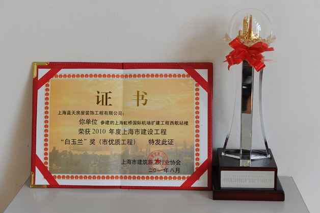 2011年8月,藍(lán)天公司參建的上海虹橋國(guó)際機(jī)場(chǎng)擴(kuò)建工程西航站樓榮獲2010年度上海市建設(shè)工程“白玉蘭”獎(jiǎng)(市優(yōu)質(zhì)工程),這是藍(lán)天公司獲得的第十一個(gè)“白玉蘭”獎(jiǎng)(市優(yōu)質(zhì)工程)。
