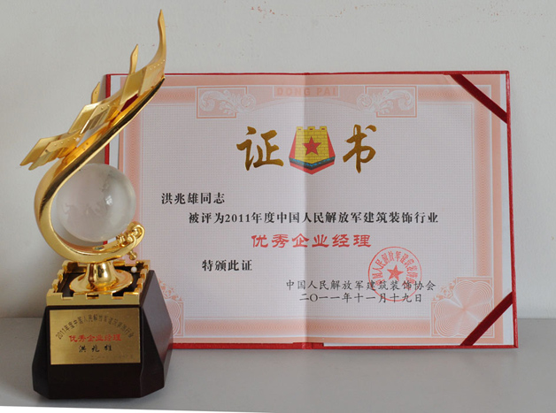 201111月,藍天公司董事長洪兆雄再次被評為中國人民解放軍建筑裝飾行業(yè)優(yōu)秀副會長、優(yōu)秀企業(yè)經(jīng)理。