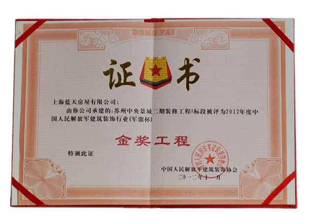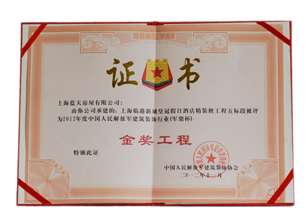 1、藍(lán)天公司蘇州中央景城二期工程、臨港新城皇冠假日酒店精裝修工程被評為全軍金獎工程。