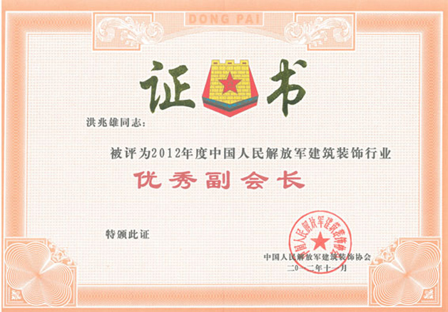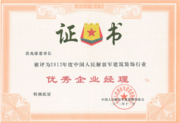 3、藍(lán)天公司洪兆雄董事長被中國人民解放軍建筑裝飾協(xié)會評為2012年度中國人民解放軍建筑裝飾行業(yè)優(yōu)秀企業(yè)經(jīng)理、優(yōu)秀副會長。