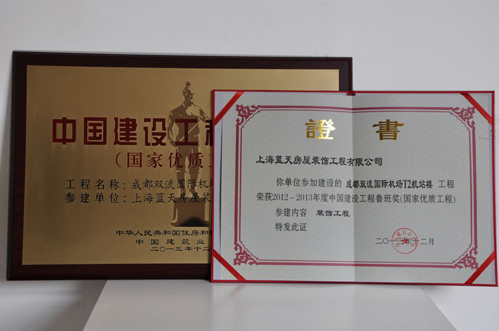 2013年12月,藍(lán)天公司上海卷煙廠“中華”牌卷煙專(zhuān)用生產(chǎn)線技術(shù)改造項(xiàng)目工程、成都雙流國(guó)際機(jī)場(chǎng)T2航站樓工程雙雙榮獲2012~2013年度中國(guó)建設(shè)工程魯班獎(jiǎng)(國(guó)家優(yōu)質(zhì)工程)。