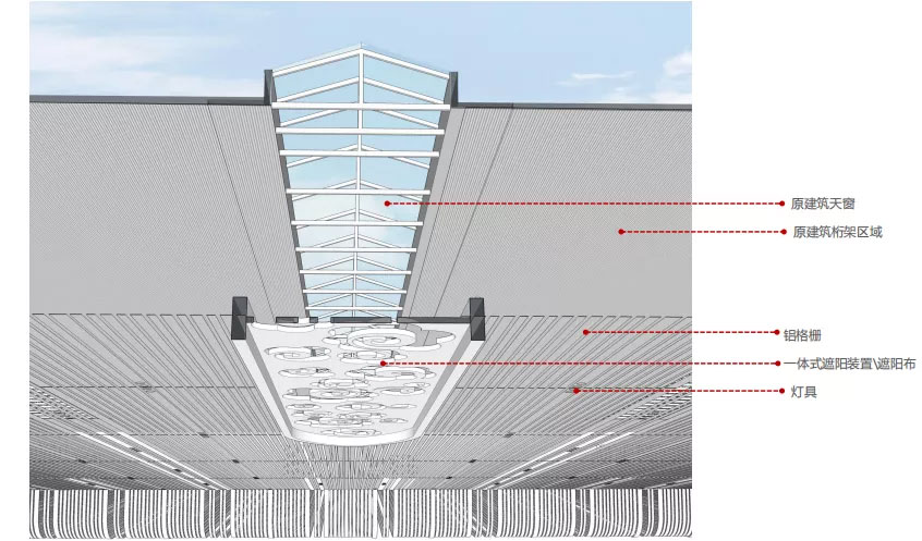 本項目大吊頂工程位于12.1m出發(fā)層,總面積約1.6萬平方米,主要施工內(nèi)容包括鋼架轉換層、白色鋁格柵吊頂、一體式遮陽裝置、燈具等。出發(fā)大廳北側9塊祥云雕花區(qū)域與透光燈膜形成一體化遮陽系統(tǒng),從而與白色鋁格柵形成整個大吊頂系統(tǒng)造型。
